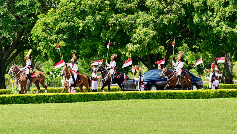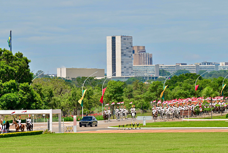 初夏時(shí)節(jié)的巴西利亞,天朗氣清。黎明宮內(nèi),綠草如茵,450名威武禮兵整齊列隊(duì)。在120名龍騎兵護(hù)衛(wèi)下,習(xí)近平乘車抵達(dá)黎明宮前廣場。