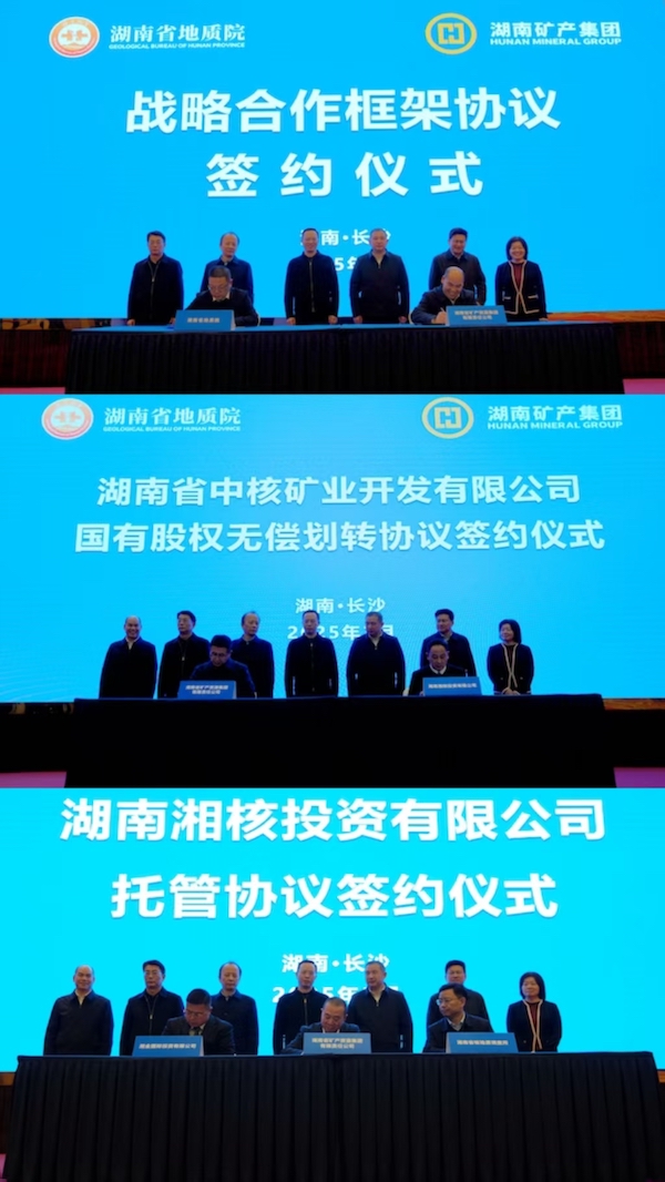 在與會(huì)領(lǐng)導(dǎo)的見證下,雙方依次簽訂了《省地質(zhì)院與湖南礦產(chǎn)集團(tuán)戰(zhàn)略合作框架協(xié)議》《湖南省中核礦業(yè)開發(fā)有限公司國有股權(quán)無償劃轉(zhuǎn)協(xié)議》《湖南湘核投資有限公司托管協(xié)議》。此次簽約,標(biāo)志著雙方在礦產(chǎn)勘查、開采及開發(fā)利用領(lǐng)域?qū)㈤_啟全方位、深層次的戰(zhàn)略合作新篇章。這一合作不僅對于深化省地勘單位改革、實(shí)現(xiàn)事企分開與主輔剝離的改革任務(wù)具有重要意義,更將極大地推動(dòng)礦產(chǎn)資源探、產(chǎn)、供、儲(chǔ)、銷體系的全面優(yōu)化與升級(jí)。通過合作,雙方將攜手為保障國家能源資源安全及重要產(chǎn)業(yè)鏈供應(yīng)鏈的穩(wěn)定提供堅(jiān)實(shí)支撐,為湖南礦業(yè)產(chǎn)業(yè)的高質(zhì)量發(fā)展注入新動(dòng)力。
