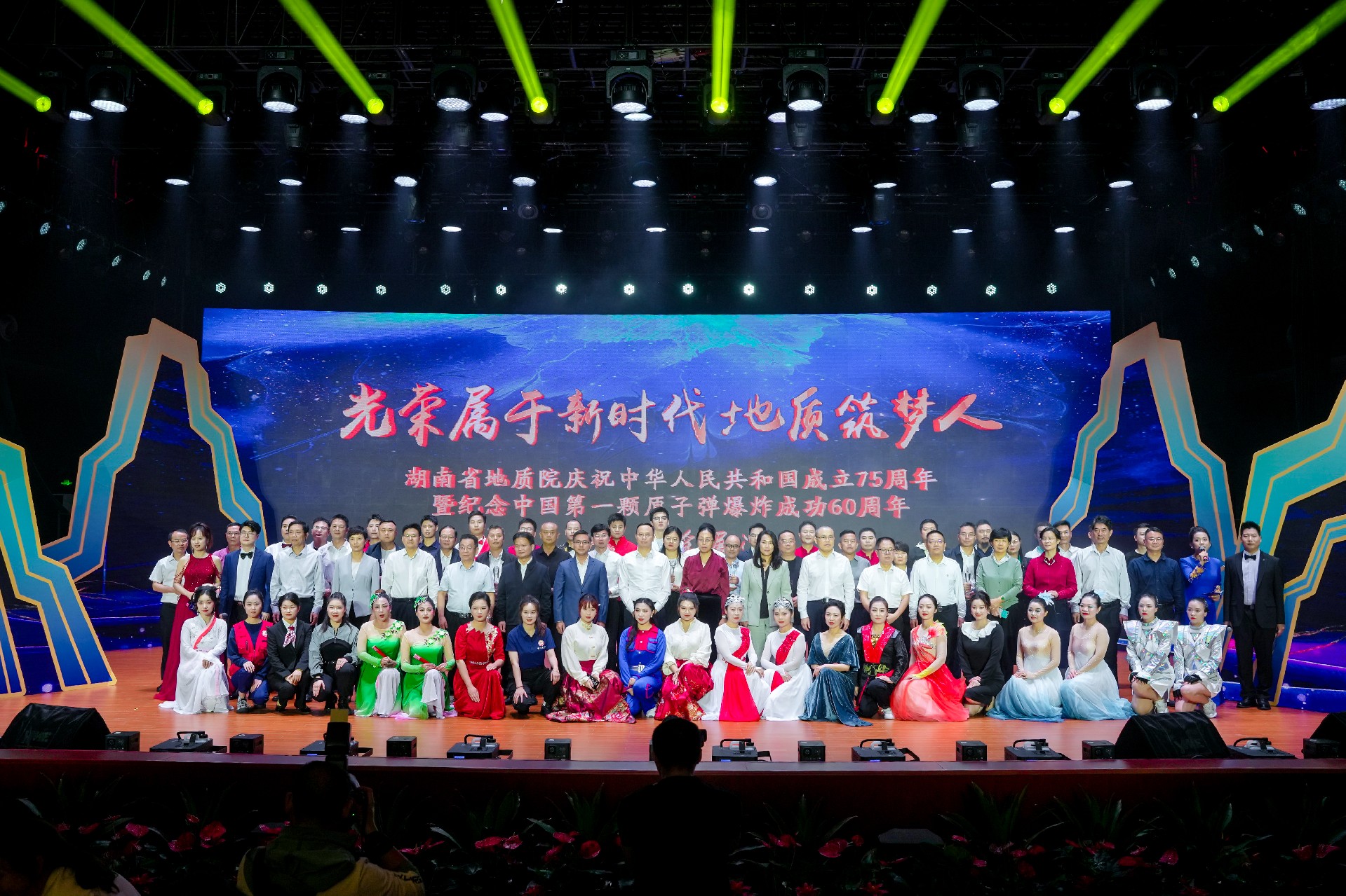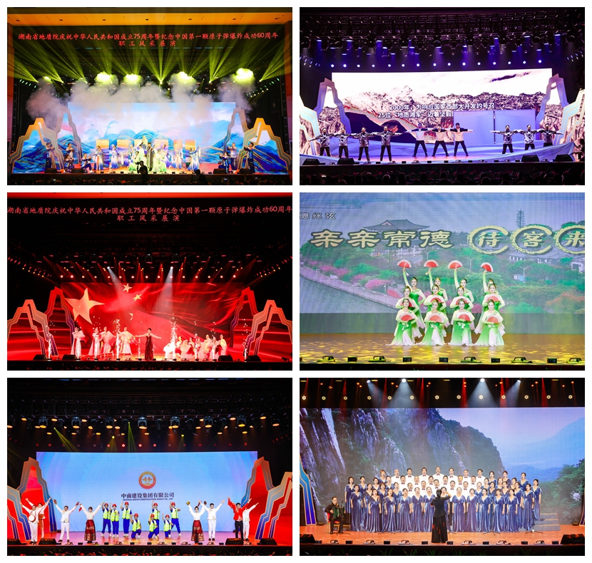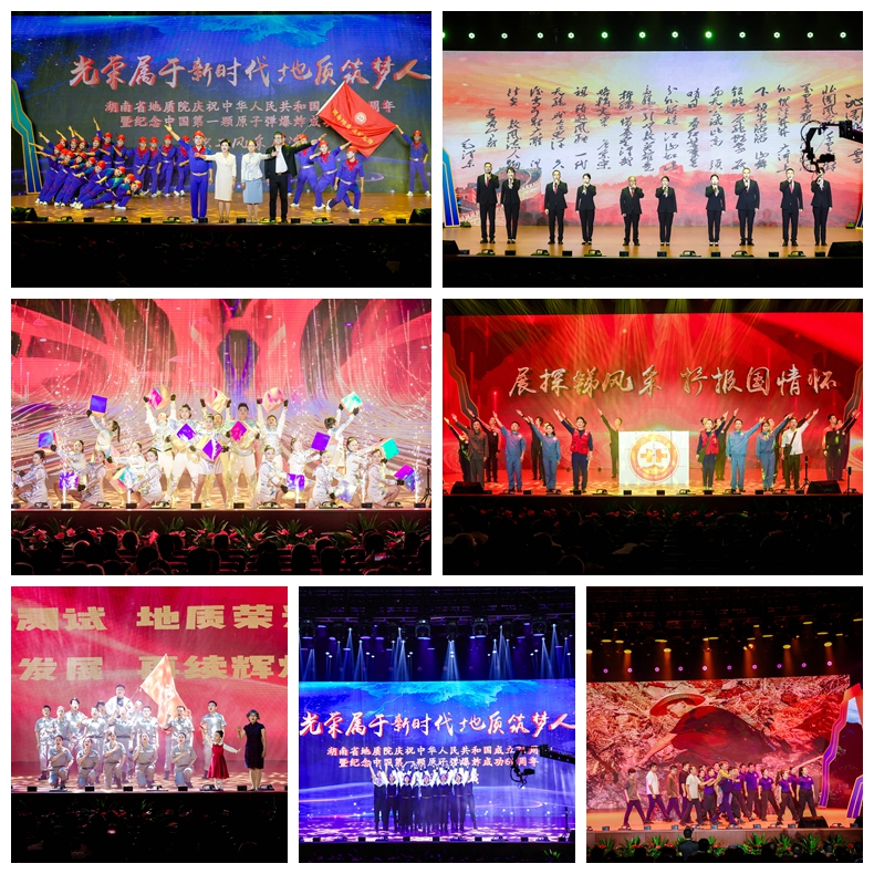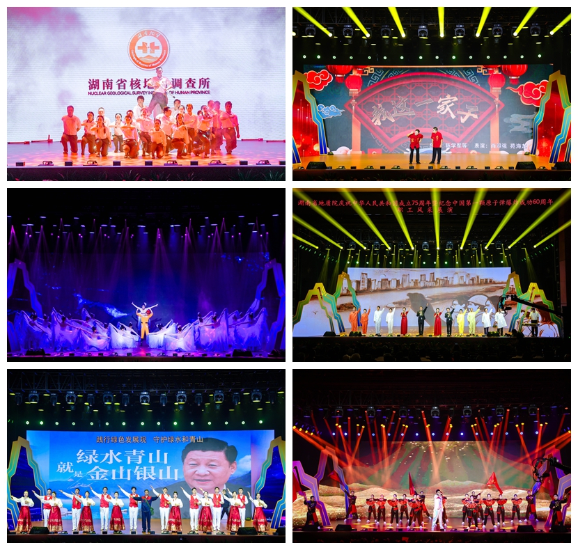芙蓉國里盡朝暉,地質院中文藝萃。10月16日,湖南省地質院慶祝新中國成立75周年暨紀念第一顆原子彈爆炸60周年職工風采展演圓滿舉辦。本次展演亦為“湖南地質文化周”啟動儀式,湖南地質鈾礦勘探陳列館也于當日開館,湖南地質文化甚濃,風景獨好。省地質院黨委書記談文勝,省直機關工委委員、省直工會主席黎池,省自然資源廳黨組成員、副廳長李定橋,省總工會黨組成員、副主席劉再衡,長沙理工大學黨委副書記方瓊,團省委二級巡視員鄧資益,葉愛斌等省地質院退休老領導,省財政廳、省紀委監(jiān)委駐省自然資源廳紀檢監(jiān)察組、湖南工人報社相關領導,以及省地質院在家院領導出席展演活動。省部級勞模代表、職工代表1400余人共同觀看演出,“湖南地質”微信視頻號同步直播,觀看人數(shù)達2.8萬人,點贊次數(shù)達15.4萬次,參與投票人數(shù)約1.2萬人。