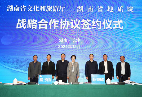 談文勝指出,地質(zhì)和文旅有著天然聯(lián)系,地質(zhì)景觀和地質(zhì)遺跡是自然景觀的重要組成部分,地質(zhì)要素是文旅產(chǎn)業(yè)發(fā)展的“本底”。省地質(zhì)院立足職能定位和特色優(yōu)勢,在發(fā)掘優(yōu)質(zhì)旅游資源、打造世界和國家地質(zhì)公園、建設(shè)地質(zhì)文化村(鎮(zhèn))、旅游景區(qū)地災(zāi)預(yù)警排查等方面做了一大批基礎(chǔ)性服務(wù)性工作,探索出了一條應(yīng)用“地質(zhì)+”模式助力“文旅富民”的道路,以實(shí)際行動(dòng)彰顯了地質(zhì)之為、地質(zhì)所能。雙方正式簽訂戰(zhàn)略合作協(xié)議,文化旅游發(fā)展與地質(zhì)技術(shù)支撐“雙向奔赴”,既是雙方面向未來的“再出發(fā)”,更是志同道合的“再聯(lián)手”。就深化雙方的戰(zhàn)略合作,他提出三點(diǎn)期盼:一要同向發(fā)力塑品牌。省文旅廳與省地質(zhì)院將雙方優(yōu)勢有機(jī)結(jié)合,圍繞合作內(nèi)容,采取務(wù)實(shí)有效措施,轉(zhuǎn)化資源為文旅魅力,打造知名湖南文旅品牌。二要深度融合拓空間。要以資源合理開發(fā)利用為核心,深化雙方在多領(lǐng)域的合作,創(chuàng)新合作模式與舉措,推動(dòng)合作邁上新臺(tái)階。三要科技創(chuàng)新建高地。融合地質(zhì)與地理信息數(shù)據(jù),利用“地質(zhì)云”和“實(shí)景三維”,賦能湖南文旅,延長產(chǎn)業(yè)鏈,提高附加值,開發(fā)湖湘特色文旅新模式。